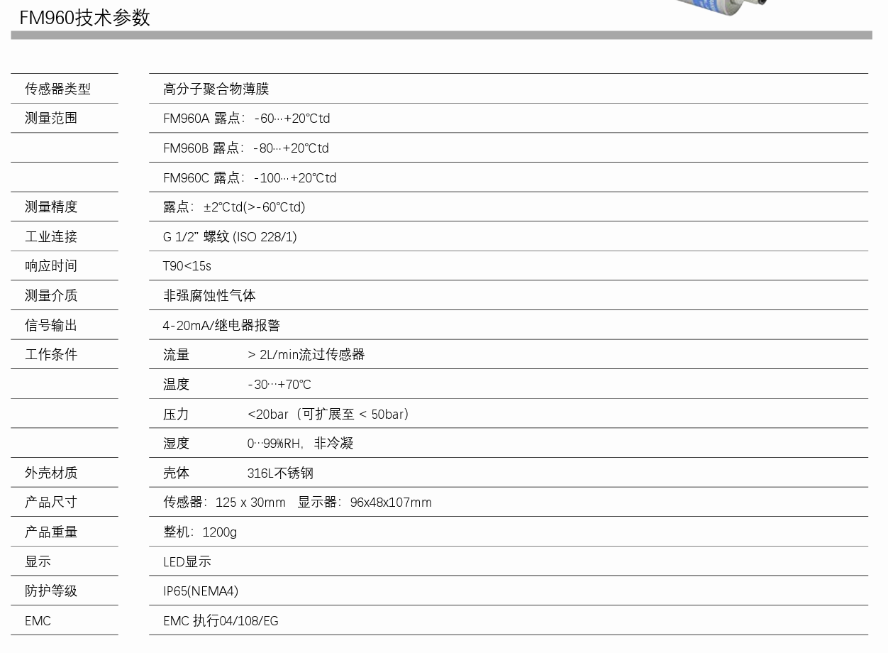 FM960是一款露点水分测量范围ZUI低可达-80℃的紧凑型露点变送器, 在干燥过程、压缩空气管道等许多工业应用提供了理想的解决方案中。采用电容式原理,灵敏度高,自带加热,适用于低露点且需要控制干点的工业环境的紧凑型露点变送器。广泛适用于电子电力等工业的气体干燥过程中。