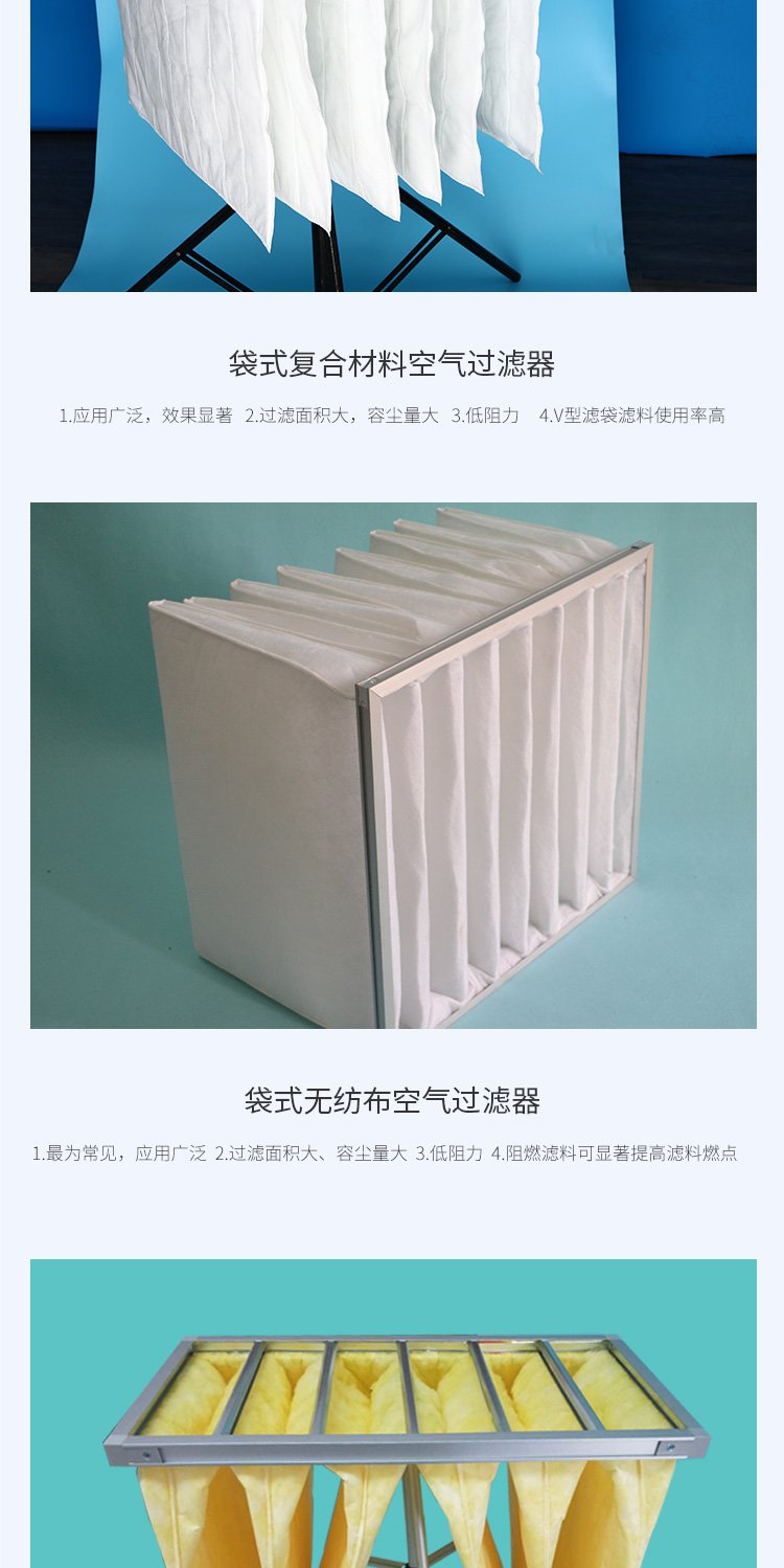 1、 中效袋式过滤器以其独特的袋式结构,确保气流均衡地充满整个袋子;独特的热熔技术可以防止袋子指尖过于拥挤或出现渗漏,这样降低了阻力