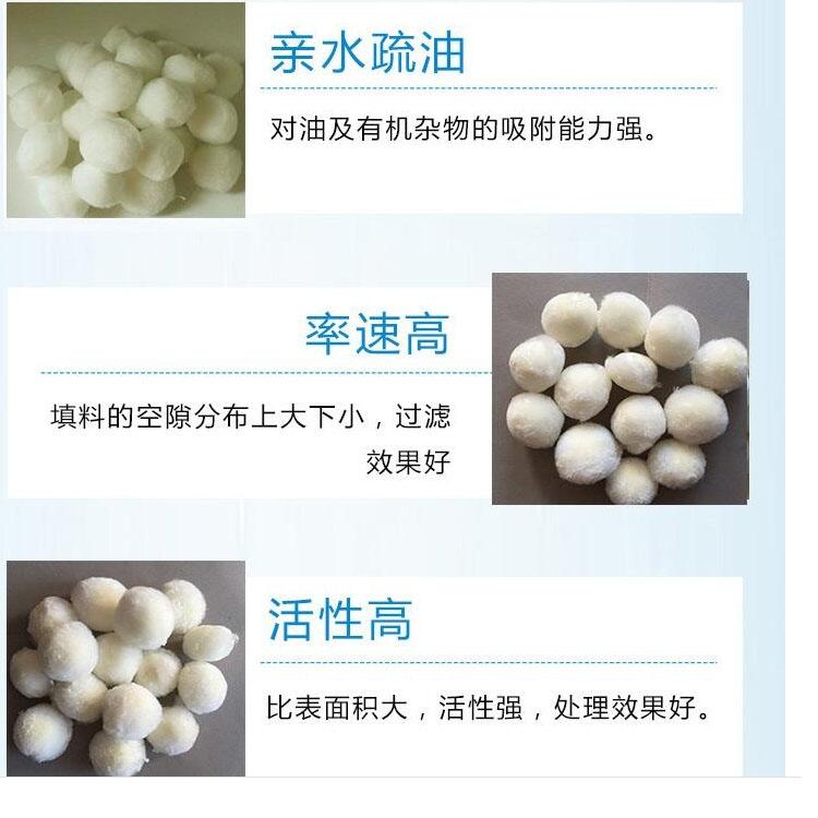 纤维球滤料是由纤维扎结而成的球形滤料,它与传统的钢性滤料相比,具有弹性效果好,不上浮水面,空隙大,工作周期长,水头损失小等优点。在过滤过程中,滤层空隙沿水流方向逐渐变小,比较符合理想滤料由上大下小的孔隙率分布,从而形成了滤速快,截污容量大,过滤效果好,可再生反复使用,不必全部更换,省时省力等优点。