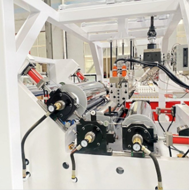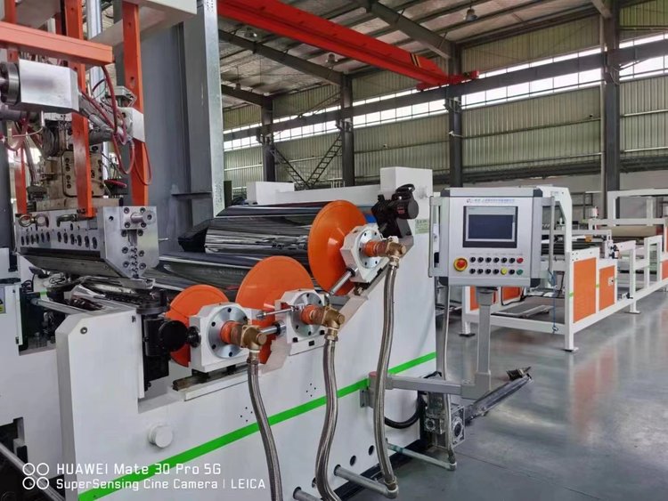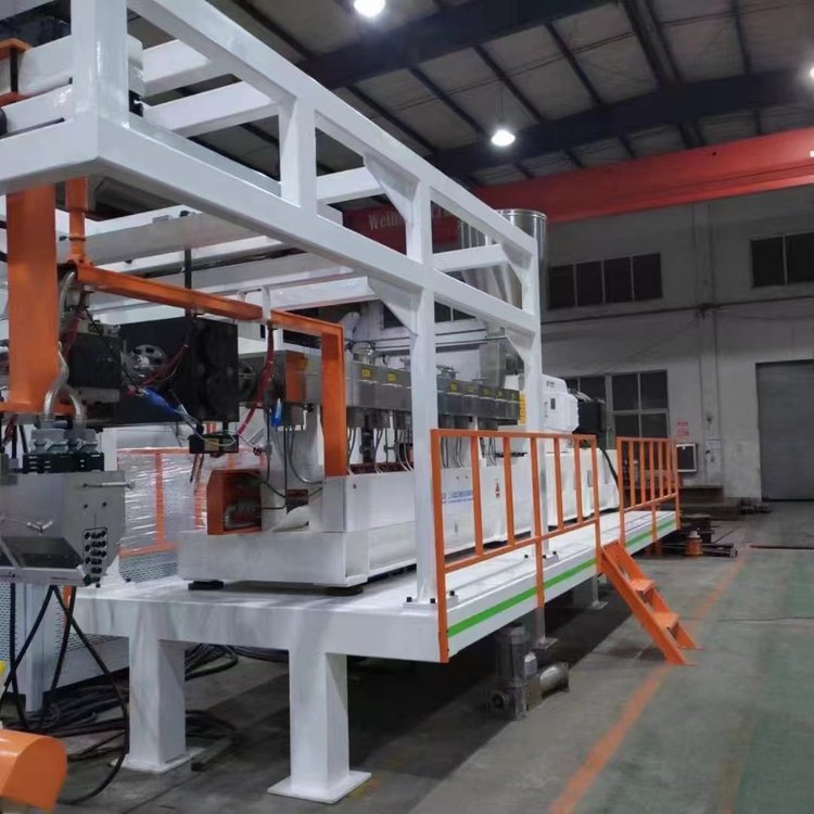 PP片材挤出机的工作原理是:利用特定形状的螺杆,在加热的机筒中旋转,将由料斗中送来的塑料向前挤压,使塑料均匀的塑化(即熔融),通过机头和不同形状的模具,挤出设备一般是双螺杆挤塑机。PP片材挤出机在挤出前,要事先检查塑料是否潮湿或有无其它杂物,然后把螺杆预热后加入料斗内。在挤出过程中,装入料斗中的塑料借助重力或加料螺旋进入机筒中,PP片材挤出机在旋转螺杆的推力作用下,不断向前推进,从预热段开始逐渐的向均化段运动;同时,塑料受到螺杆的搅拌和挤压作用,并且在机筒的外热及塑料与设备之间的剪切摩擦的作用下转变为粘流态,在螺槽中形成连续均匀的料流。PP片材挤出机在工艺规定的温度作用下,塑料从固体状态转变为熔融状态的可塑物体,再经由螺杆的推动或搅拌,将w全塑化好的塑料推入机头,到达机头的料流,经模芯和模套间的环形间隙,从模套口挤出片材,(模具的厚薄可根据客户的需求调整),片材进入三辊定型、冷却、整平,经冷却导辊支架冷却,取产品尺寸计时器确定尺寸剪切,剪下来的产品进行打包,整条双螺杆板材挤出机工艺生产完毕。