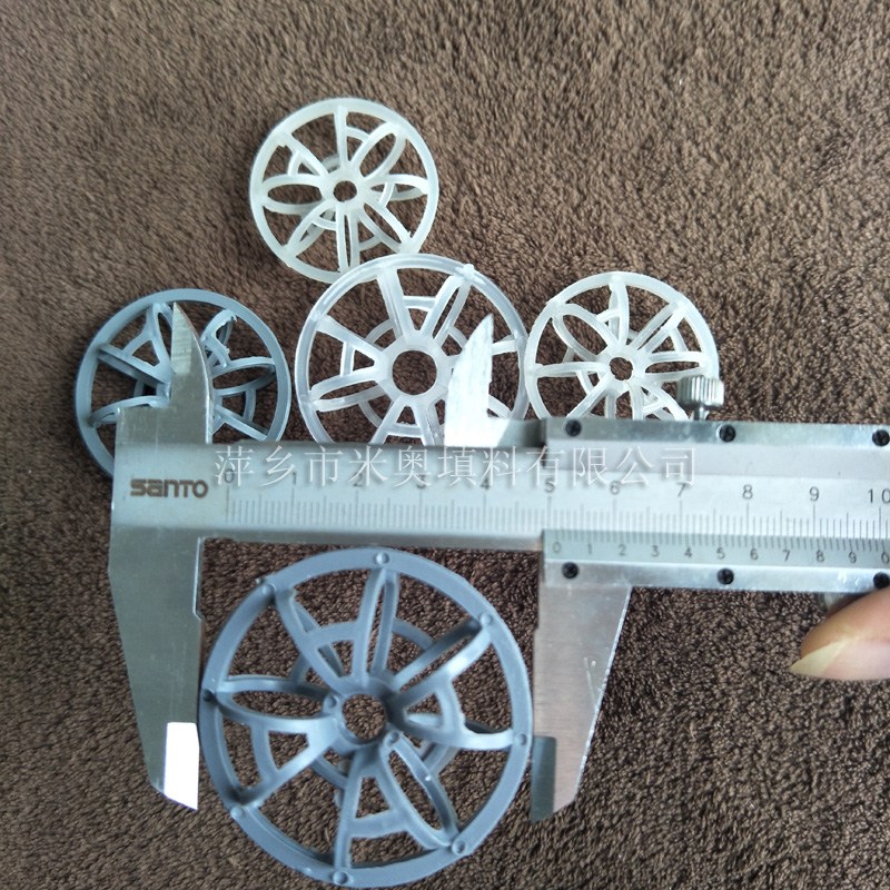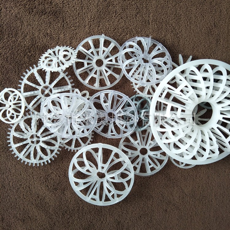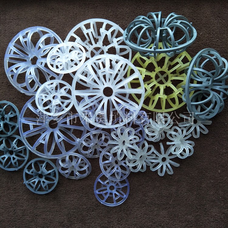 塑料花环填料早是由美国A.J.Teller于1954年研制开发出来的,故而常称之为泰勒花环(TellerRosette)。由于填料的空隙处能有较高的持液量,可使塔内液体的停留时间较长,从而增加了气液两相的接触时间,提高了填料的传质效率。 花环填料也称梅花环填料塑料花环填料是由12个小圆环按径向排列而组成的一个大扁球体,很类似于一个螺旋形弹簧首尾相接绕成的一个圆球体。有的小圆呈A字;有的在小圆和大圆边沿还带有齿;有的外围没有大圆圈,只有里面的小圆组成等,客户可根据各自的要求订购不同种类的花环。