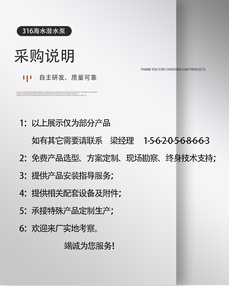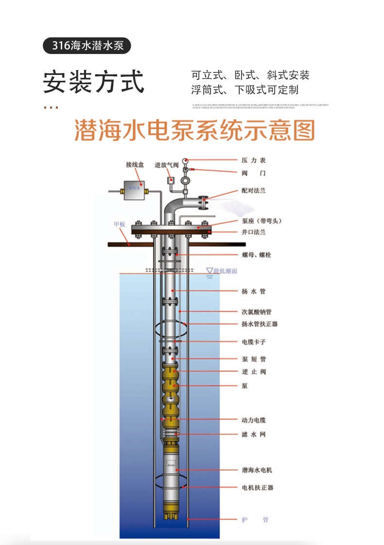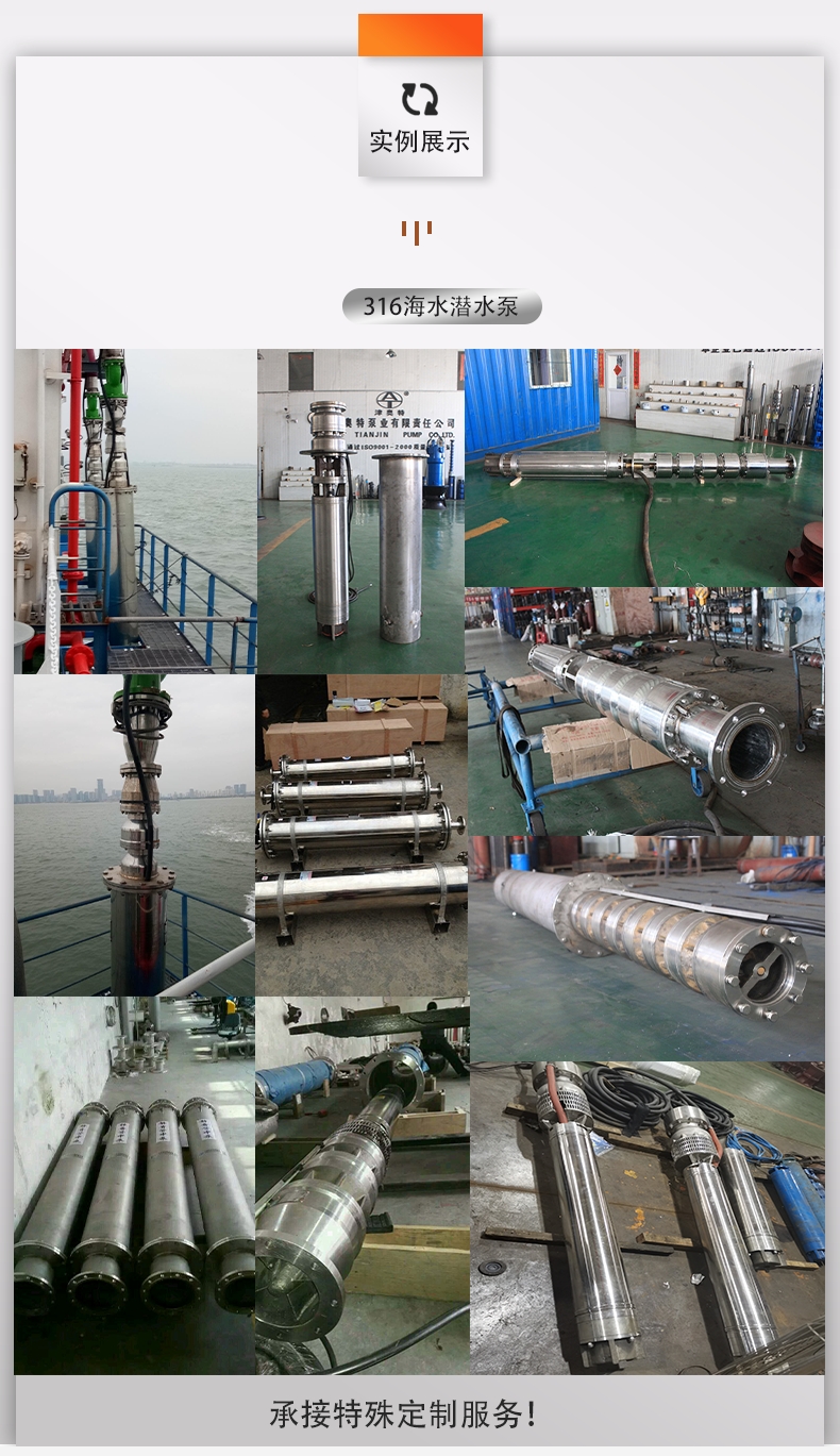 公司主营产品有:QJ深井潜水泵|QJR热水潜水泵|QK矿用潜水泵|QJT大流量潜水泵|QH海水潜水泵|耐高温潜水泵|不锈钢潜水泵|高扬程潜水泵|WQ/QW污水潜水泵|QHB/QZB潜水轴流(混流)泵|QJP喷泉泵|温泉泵|QJX下吸式潜水泵|lx螺旋离心泵|YQS系列潜水电机|YQSH系列海水潜水电机|YQSR系列热水潜水电机|JQS系列三相异步潜水电动机|1215-1234RITZ系列三相异步潜水电动机、1142-6H1178RITZ系列高压潜水电机、2,4极RITZ系列变频潜水机等系列产品;并且诚接特殊要求订制潜水电机。公司内有铸造车间、加工车间、装配车间、潜水电机及水泵测试站以及工模具、备品备件、各类库房等,职责明确,管理规范,2005年公司审核通过了ISO9000-2000质量体系认证,2010年参加了上海世博会民间企业展览并取得了证书。