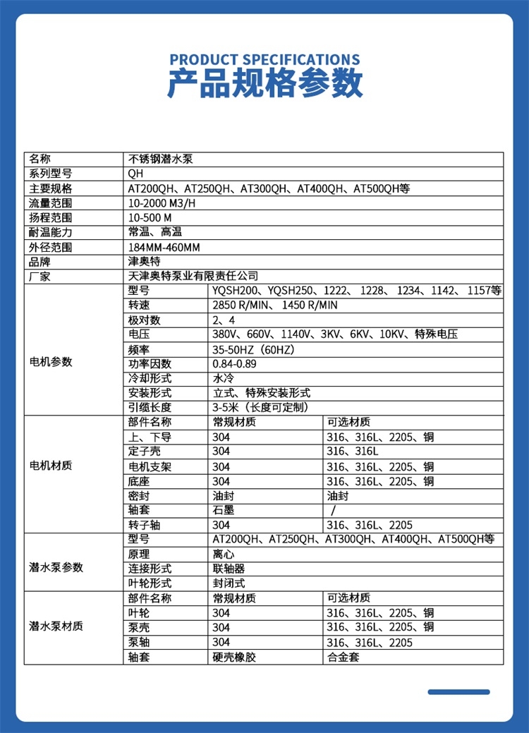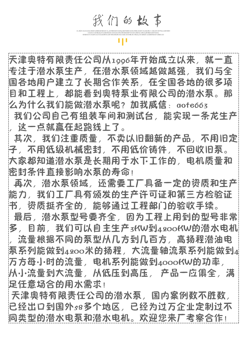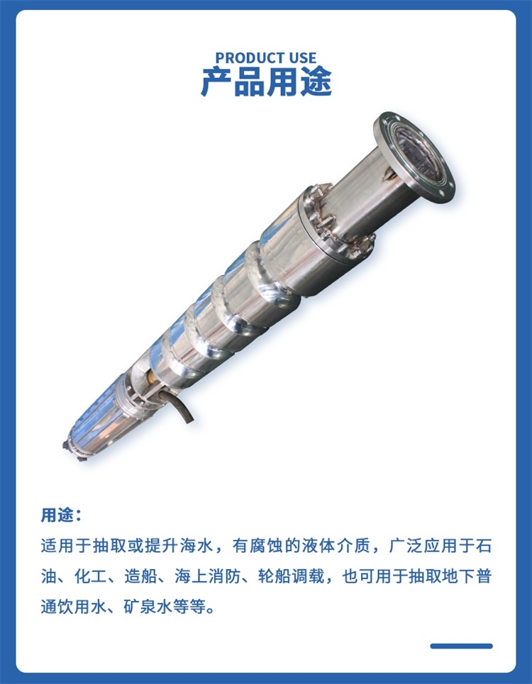 不锈钢潜水电泵,是机泵直联一体的井用潜水电泵,直接潜入水中运行。结构细长。单级或多级上泵式充水湿式三相异步电动机潜水电泵。是专门为有腐蚀性液体设计,可用于抽送海水、化工废水、也可用于农用排灌、喷灌,工业及民用建筑的排水系统研制,适用于池塘、养鱼池,水塔、深井提水及高楼送水,喷泉。耐高温125度,承接定制服务;厂家直销1-5-6-2-0-5-6-8-6-6-3梁,可定制高温热水型不锈钢潜水泵、卧式不锈钢潜水泵。