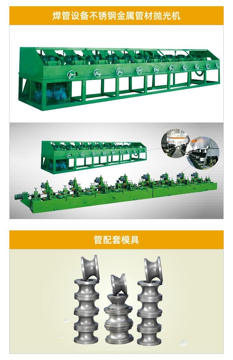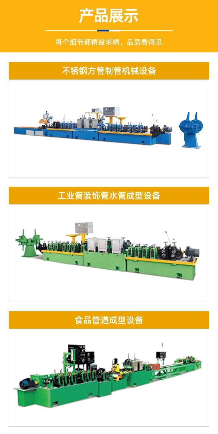 通用型设备可以制作的管材多样,如常见的圆管、方管、矩形管,一些异型管也可以制作,如槽形管、三角管、椭圆管、半圆管、多边管、门框不锈钢管、螺纹管、航天工业用管等。制管设备生产流程:经开卷、打商标、成型、焊接、打磨、定径、校直、定尺、切割、下料连续工艺。机型多样,设备制作范围更是广泛。以下提供通用型设备的技术参数,如需其他机型的参数或者是定制机型