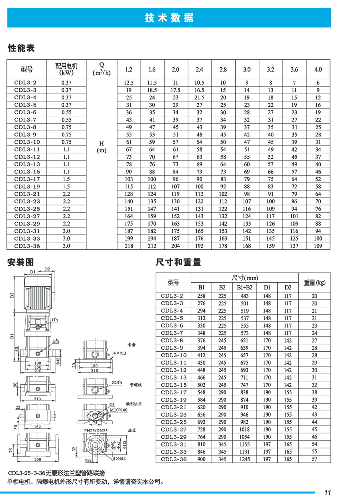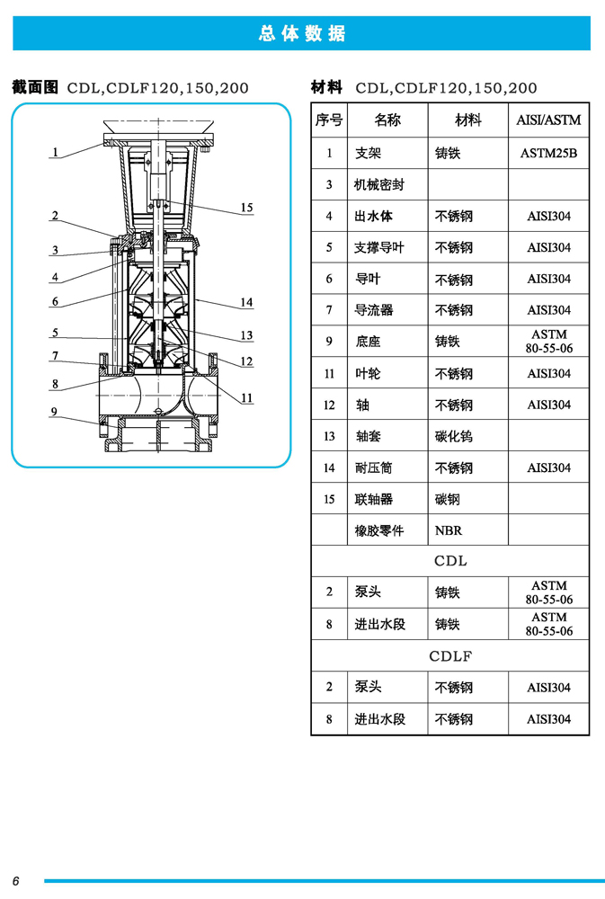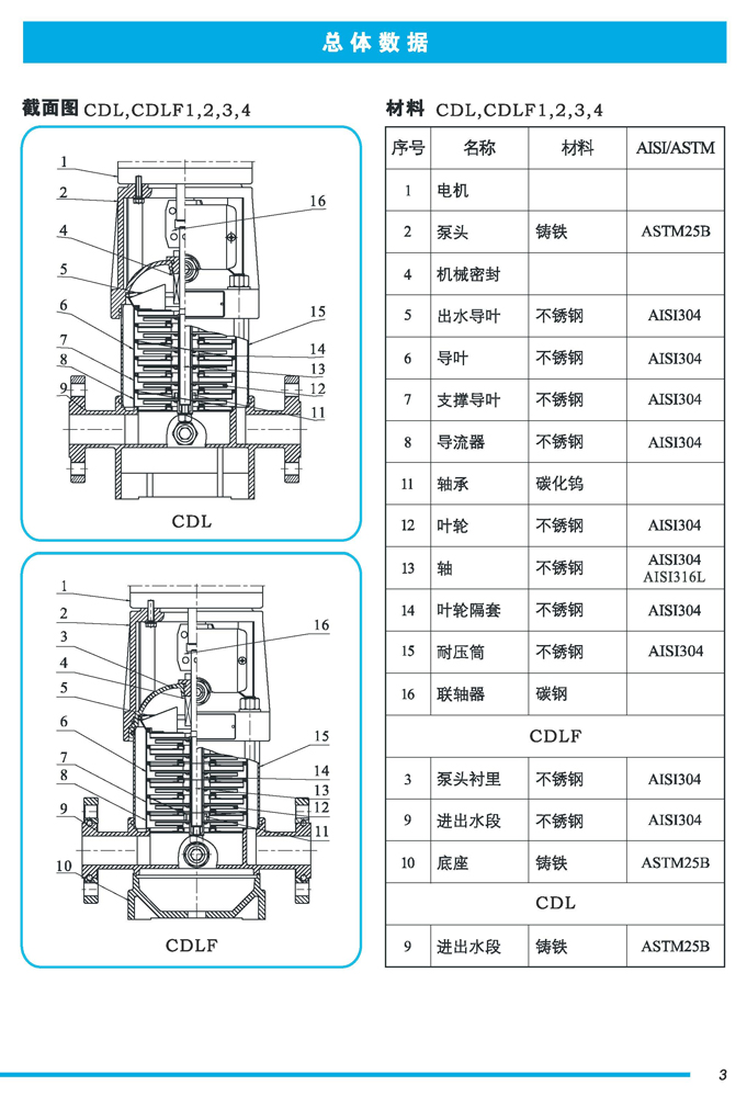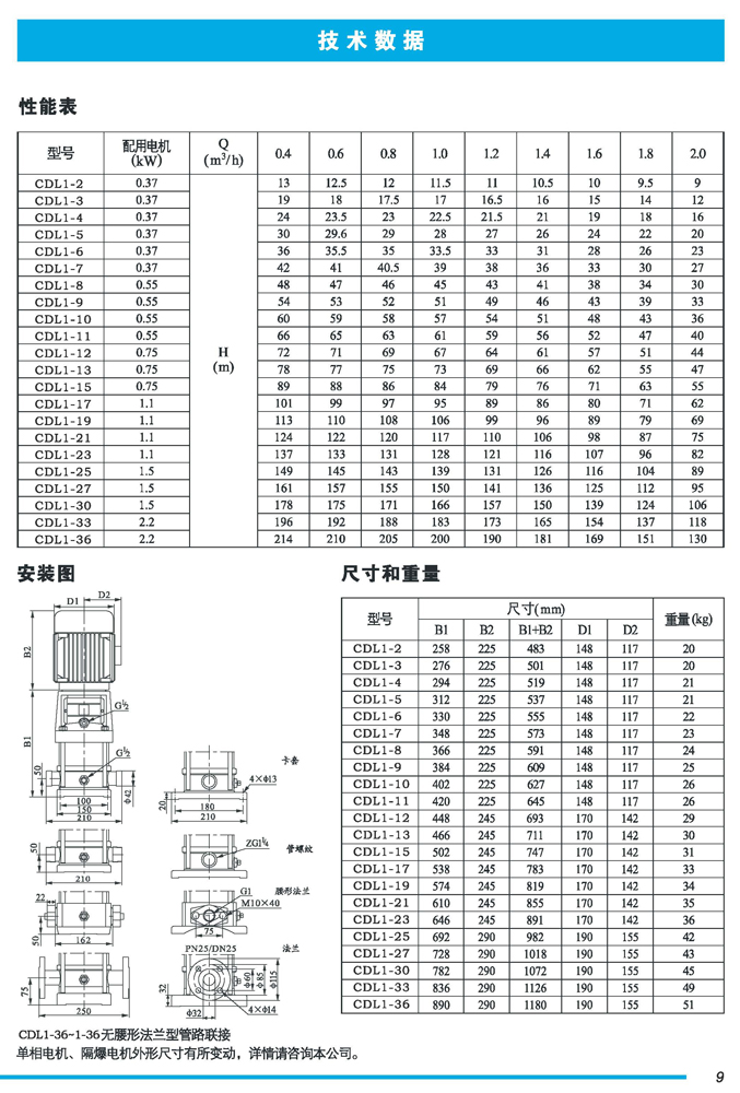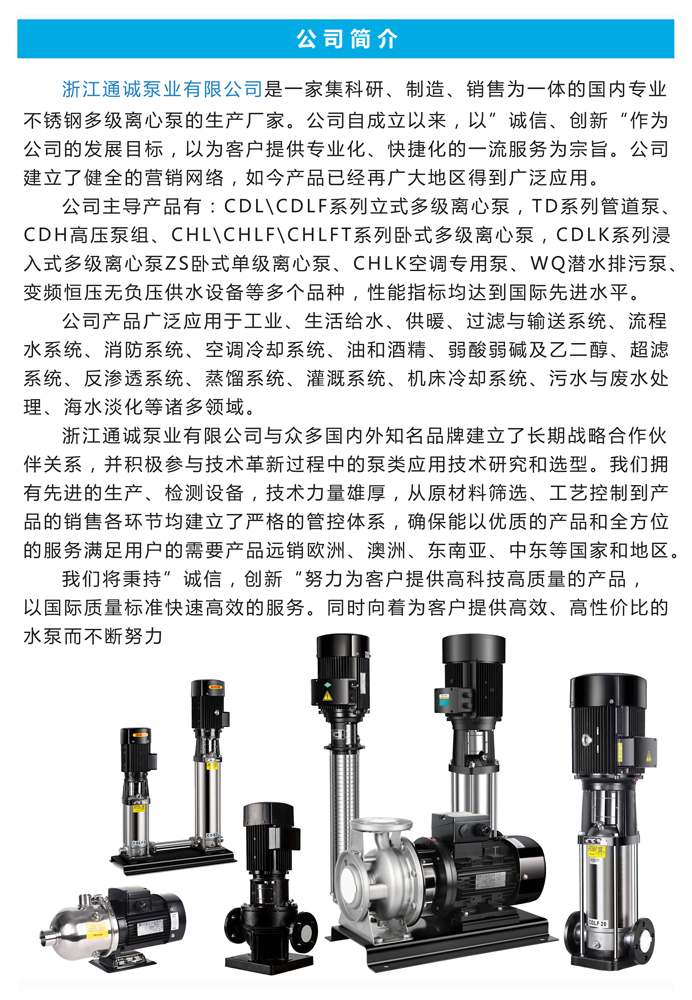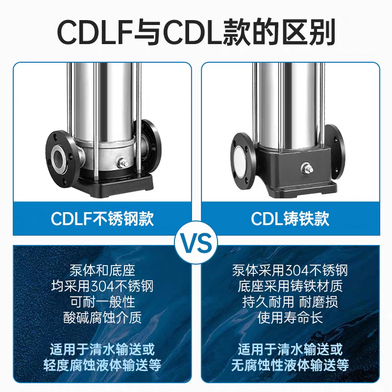 CDL|CDLF不锈钢立式多级离心泵是一种多功能产品,可以输送从清水到工业液体的各种不同介质,适用于不同温度、流量和压力范围,CDL型适用于伍腐蚀性液体,CDLF型适用于轻度腐蚀性液体。
