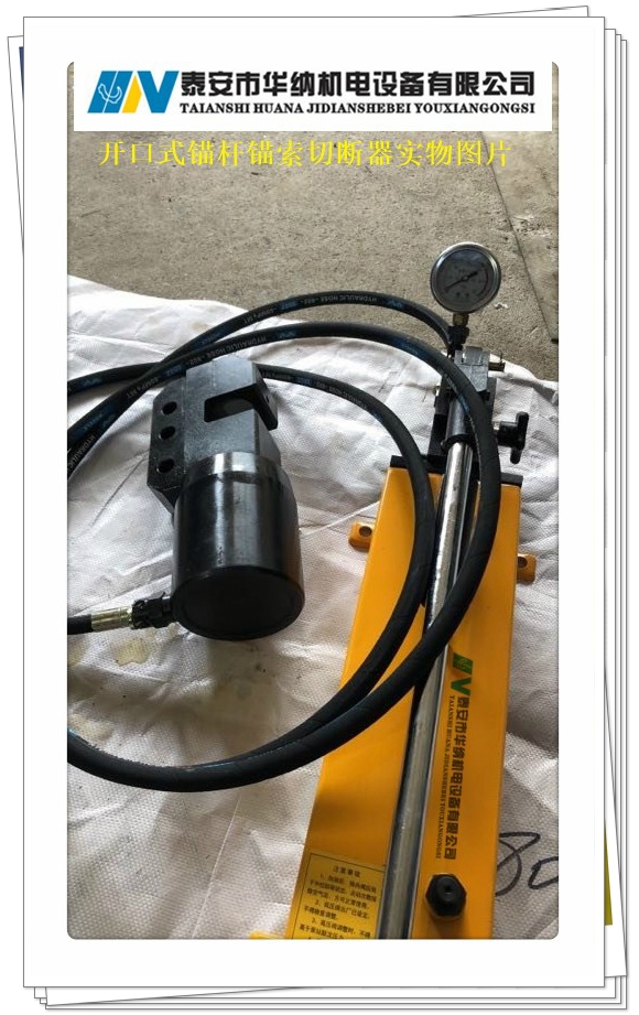 开口式锚杆切断器产品用途:在煤矿巷道掘进支护中,当被剪锚杆带有托盘或锚索(钢绞线)端部钢丝散开时,穿心式切断器已失去作用,而泰安市华纳机电设备有限公司生产的侧开口锚杆锚索切断器(多功能锚杆剪切机/锚索剪切机,钢筋切断器,钢丝绳切断器)能有效的解决问题。锚杆切断器体积小,重量轻,剪切力大、安装优质刀头,切断快且经久耐用。可安全快速地剪断ф24mm以下的高强度锚杆或18.9以下的锚索。