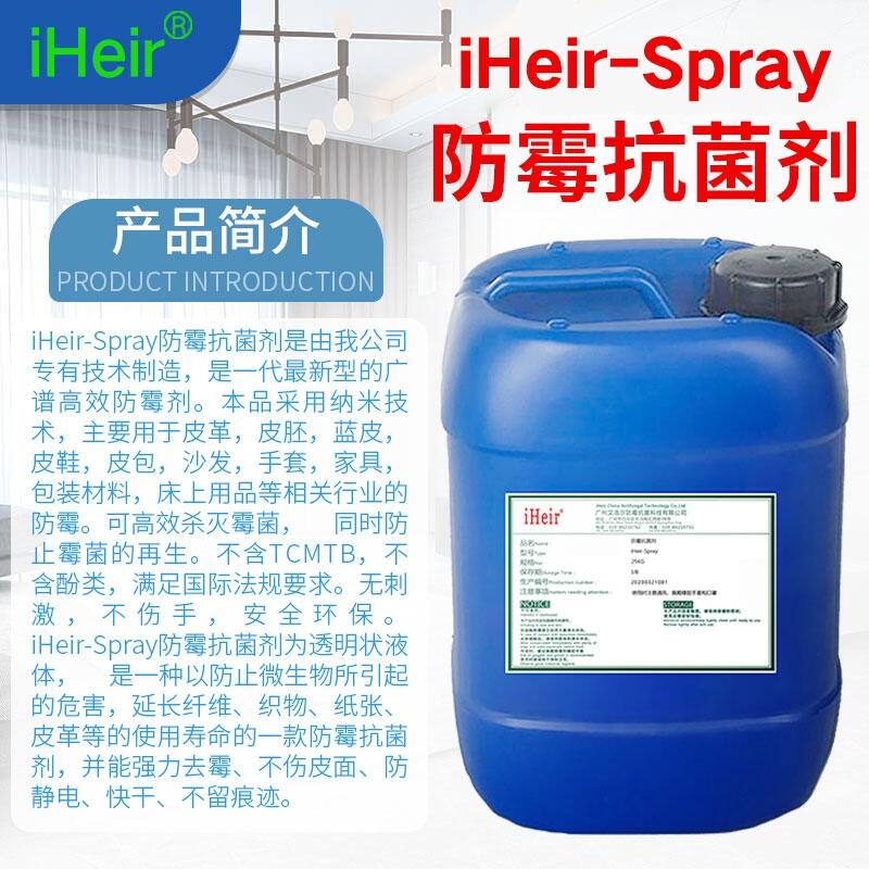 iHeir-Spray是由我公司专有技术制造,是一代最新型的广谱高效防霉剂。本品采用纳米技术,主要用于皮革,皮胚,棉麻,皮包,沙发,手套,背包,家具,包装材料,床上用品等相关行业的防霉。可高效杀灭霉菌,同时防止霉菌的再生。不含TCMTB,不含酚类,满足国际法规要求。无刺激,不伤手,安全环保。