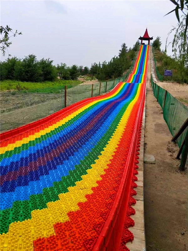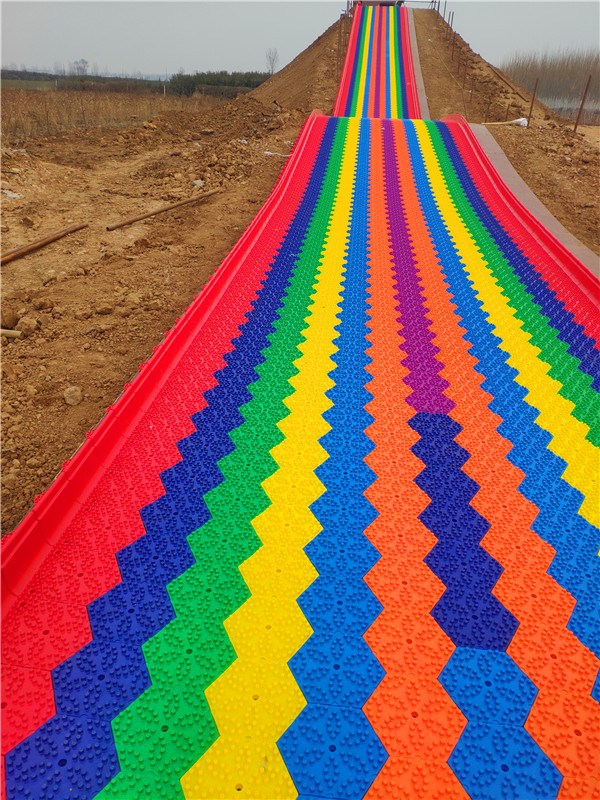 彩虹滑道长度是可以定制的,长度达到100至150米,还有长达260米的。这么一条长长的彩虹滑道铺在那里,何等的壮观宏伟,远远的就可以吸引住人们。而且彩虹滑道玩法惊险,让游客们在游玩的过程中体验到旋转感、倒滑感、失控感、碰撞感等。另外彩虹滑道是和雪圈搭配使用的,姐妹组、兄弟连、全家福等玩法都可以得以实现。让人们更有参与感和互动感。
