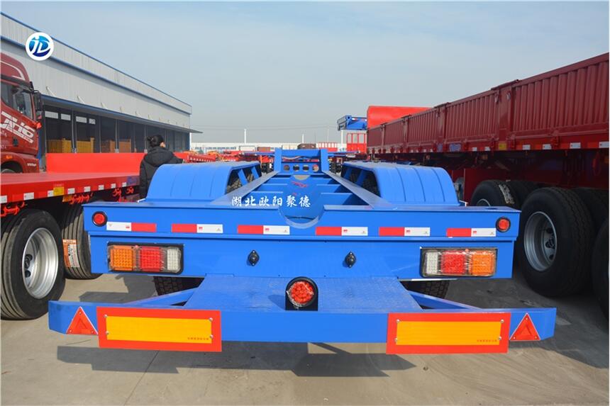 此车型分为平板式和骨架式,前者有平板货台,也可用来装运普通长大货物;后者无货台,集装箱装到底盘骨架上,由扭锁装置固定成为半挂车的强度构件。