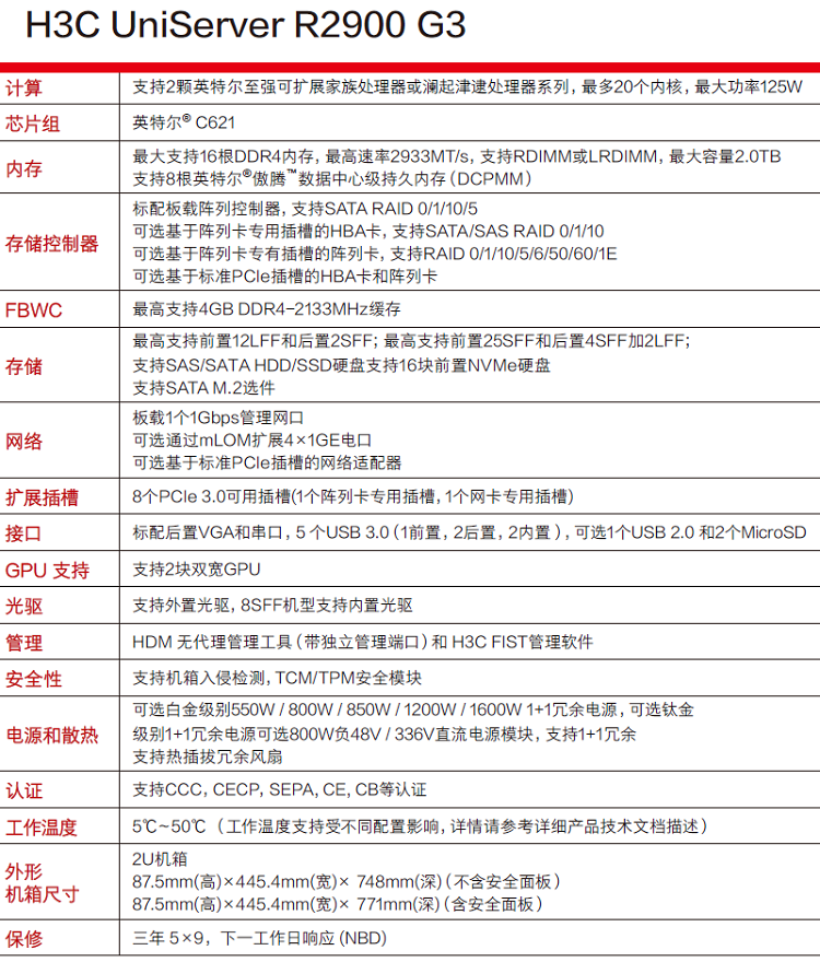 工程师推荐 | 新华三H3C R2900G3 2U机架式服务器主机 文件存储ERP数据库服务器D 2颗至强4216 32核2.1G 64G丨4块2.4TB 10K SAS硬盘 |
