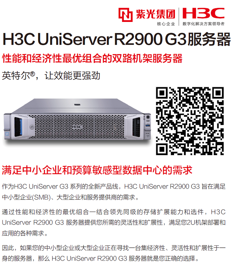 项目推荐 | 华三(H3C)R2900G3 8LFF 1*4210R/1*16G内存/2*4TB SATA/P460(2G)/4*1GE/1*550W |