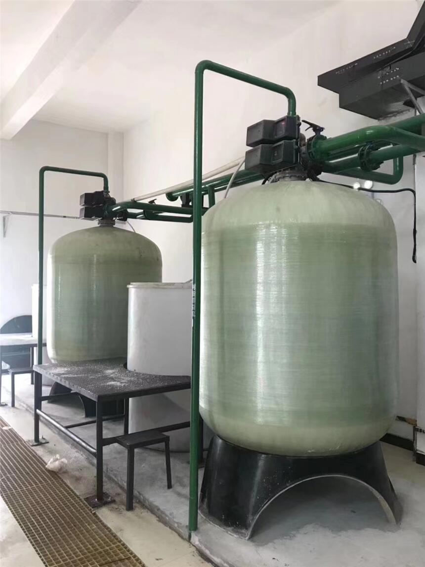 该产品是采用强酸性苯乙烯系钠型树脂(NaR)将原水中的硬度成分Ca2+、Mg2+置换出去,使原水得到软化,其反应为:2NaR+Ca2+(Mg2+)=R2Ca(Mg)+2Na+。当树脂置换到一定量的钙、镁后,就会失去置换能力;可以用一定浓度的盐水浸泡,使其恢复交换能力,其反应式为:R2Ca(Mg)+2Na+=2NaR+Ca2+(Mg2+)。再生过程包括:反洗(松动树脂层)—吸盐慢洗(置换过程)—正洗(将钙、镁离子冲掉)—注水(为下次再生准备)。
