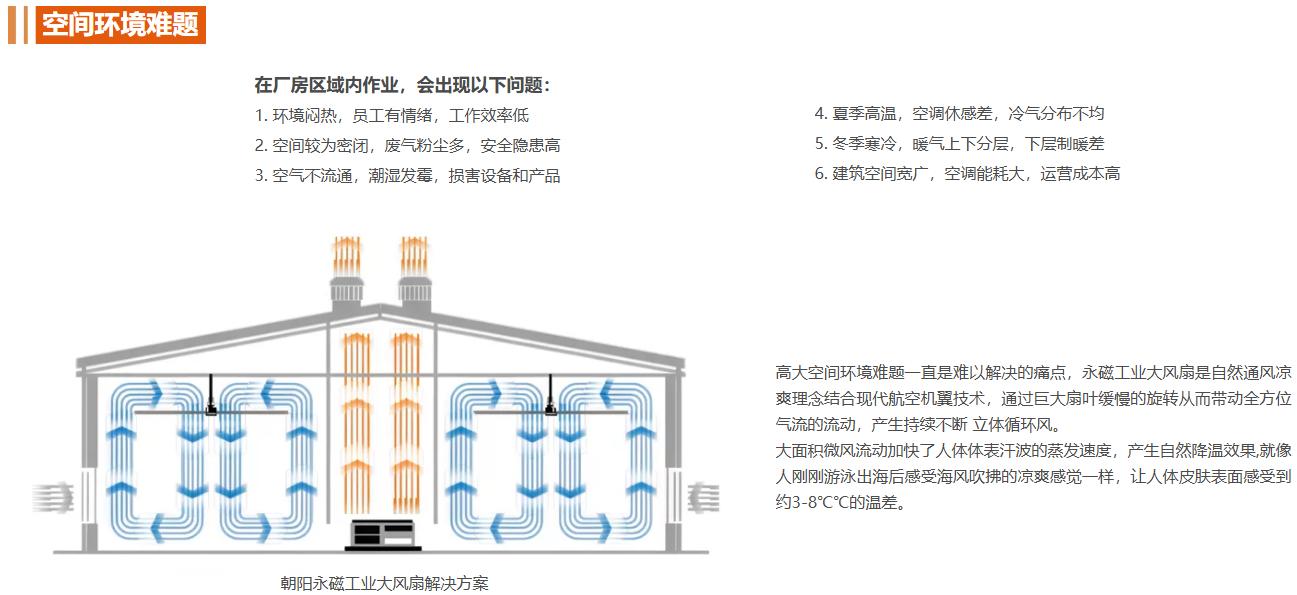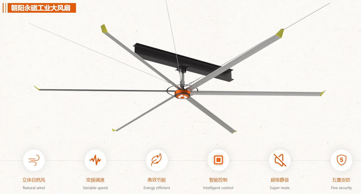 朝阳永磁工业大风扇6大特点:立体自然风变频调速高效节能智能控制超级静音五重安防