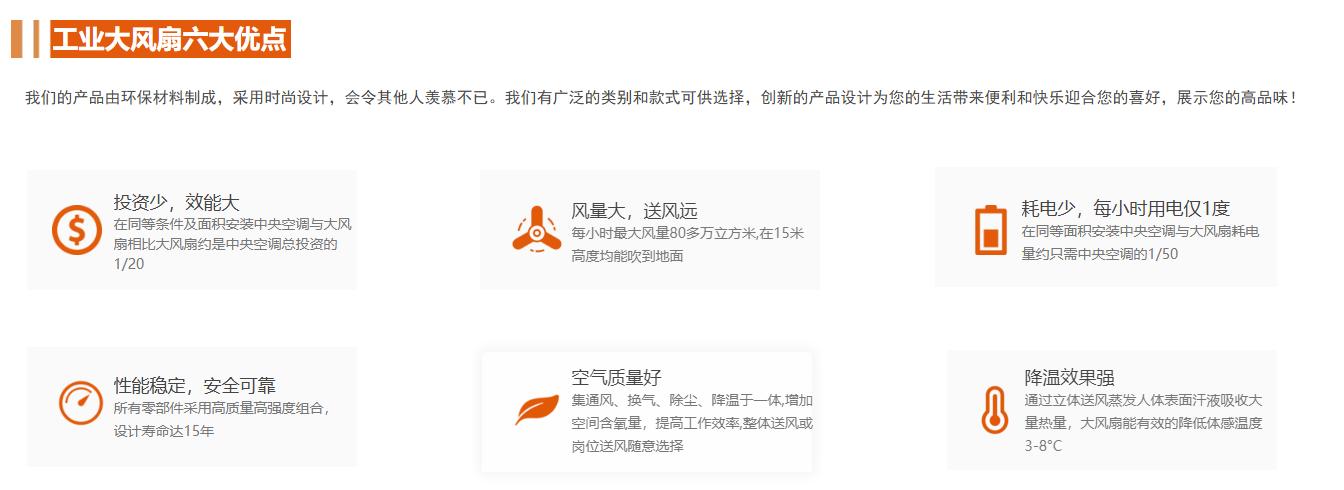 在同等条件及面积安装中央空调与大风扇相比大风扇约是中央空调总投资的1/20;2.风量大,送风远每小时最大风量80多万立方米,在15米高度均能吹到地面3.耗电少,每小时用电仅1度在同等面积安装中央空调与大风扇耗电量约只需中央空调的1/504.性能稳定,安全可靠所有零部件采用高质量高强度组合,设计寿命达15年5。空气质量好集通风、换气、除尘、降温于一体,增加空间含氧量,提高工作效率,整体送风或岗位送风随意选择6.降温效果强通过立体送风蒸发人体表面汗液吸收大量热量,大风扇能有效的降低体感温度3-8°C